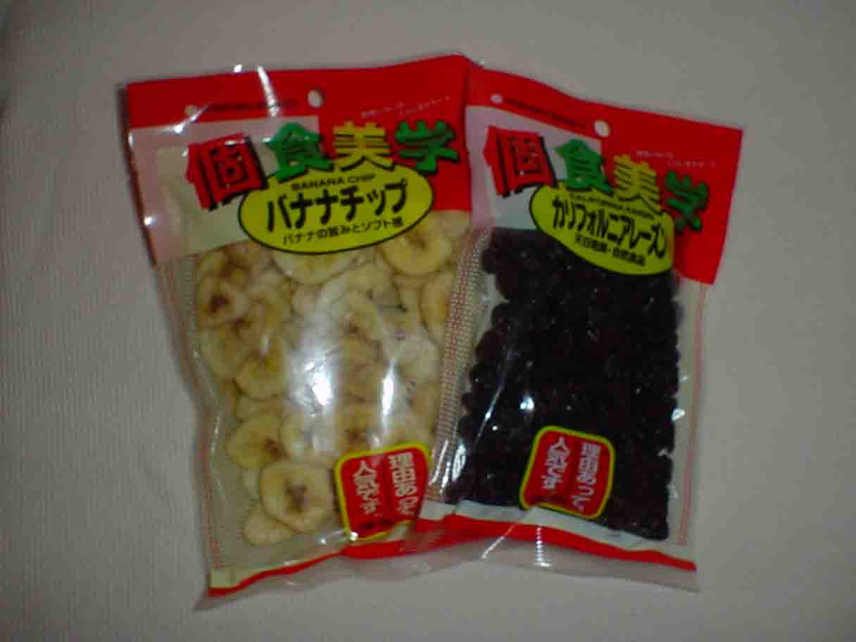甘いもの好きな私は、お腹が空いたら、もちろん、甘いものに手が伸びてしまいます。せっかく、食べるのだから、甘くても、栄養のあるものが食べたいと思い、考え出したのが、バナナチップと干し葡萄です。バナナチップは、糖分が加わっているものの、もともとは塩分を流してむくみ解消のカリウムと食物繊維の多いバナナから出来ています。干し葡萄は、鉄分が多くて、これまた、カリウムを含んでいます。今、話題の抗酸化作用のあるポリフェノールを含んでいます。 バナナの栄養:http://www.sweetio.com/ 干し葡萄の栄養:http://village.infoweb.ne.jp/~crohn/talking/makeing.htm |