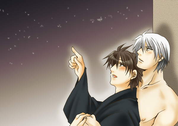 真里野の腕の中の九龍は、彼の肩に頭を預け…星空を見つめ、笑う。