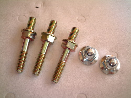| これが、ボルトを立てた状態。 左右手前二本は購入したナットを取り付けて固定用に、奥のボルトはエンジンカバーのスリーブに通してエンジンカバーの位置決め用に使用します。 |
