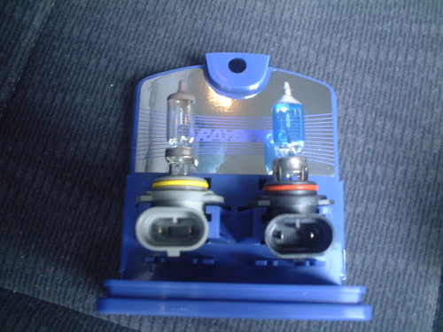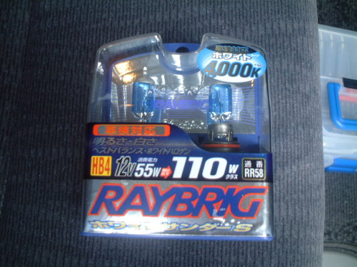 | 「どーせそのうち変えるし・・」と思ってフォグ球も一緒に買って交換しちゃいました。 フォグなんで黄色を探したけどなかったんで、青色っぽくならない4000Kのホワイト球を買いました。 |