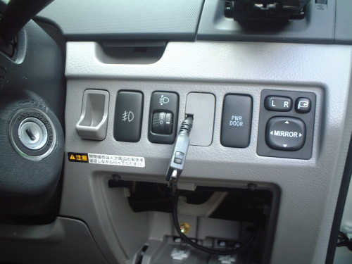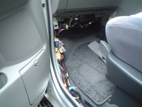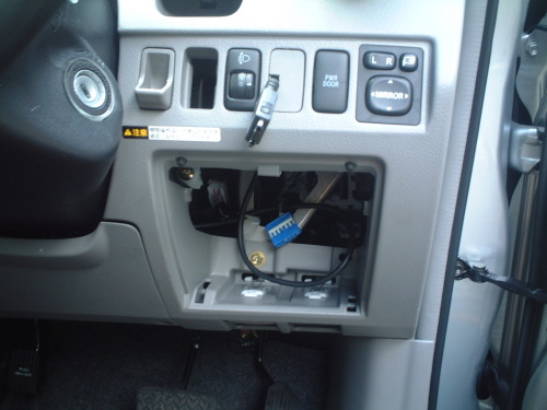 | スイッチを取り付けます。 運転席下にあるインストメントパネルボックスを取り外し、奥にある青色6Pコネクターを引き出してきます。 上部のスイッチのうち一個蓋を取り外しておきます。 |