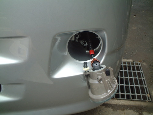| バンパーとの隙間からフィニッシャーが付いていた部分まで、ハーネスを渡します。(左右共) | |