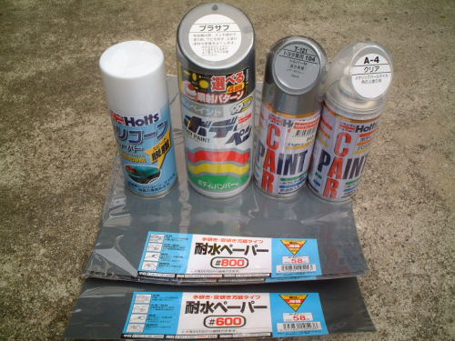 | このまえamado行ったときにスプレーなど購入しました。 左からシリコンオフ(脱脂用スプレー)、プラサフ(塗装の食い付をよくする)、シルバーメタリック色(1D4)、クリアー(メタリック色には必要)、それと耐水ペーパー。 |