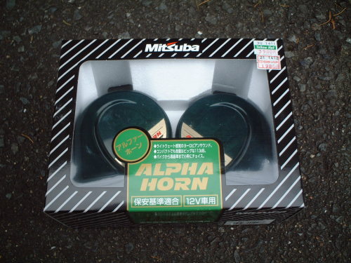 | 純正のホーンは、耳障りなんで社外品のホーンに交換することにした。 「mitsuba」のアルファーホーン。「黄色い帽子」で、限定5個1980円で売ってたので、速攻で買ってしまった。 |