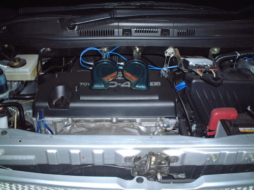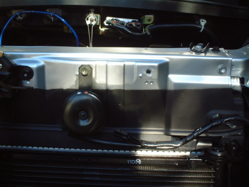 | グリルを交換した時に、アルファーホーンがグリルと干渉したため純正ホーンに急遽交換していたが、ボンネットの中身を見ているとエンジンの上あたりにボルトが出ていたので、これにアルファーホーンを取り付けることにした。 (確か、4WD車はここに何かユニットがついていたと思う。) エンジンの上っていうのは気になるが、エンジンカバーもついてる事ですし、まあ大丈夫でしょう・・・ |