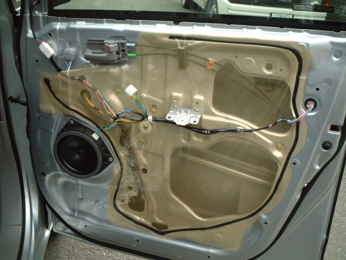 | ミラー内部に配線処理をするため、フロントドアの内張りをはがしました。 納車してからはがしたことなかったけど、こんな風になってるのね。 ミラーを取り外すために、右上のカプラーを外しておく。 |