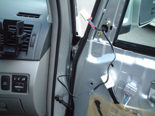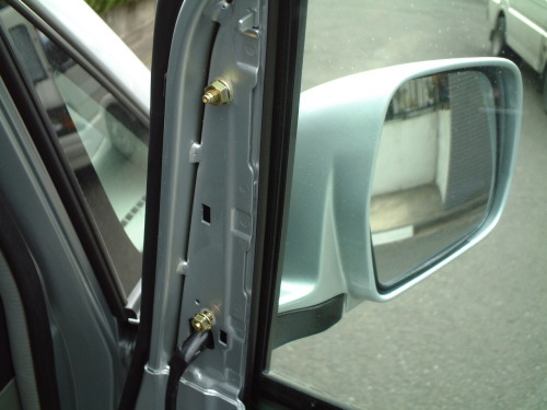 | ミラー取り付けは、基本的に取り外しの反対作業。 配線は、ドアから車体へ通すケーブルダクトに入れようと思ったけど、入れた後のボンネットへの配線がめんどくさそうだったのでやめ。 ドアと車体との間を見ると、タイヤハウス上に隙間があってそこを通せば簡単にボンネットまで通せそうだったのでそこに通しました。 |