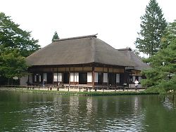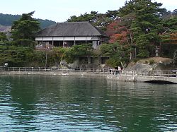 | 【観瀾亭(かんらんてい)】↓ 松島の観光船乗り場の近くに有ります。 伊達政宗が豊臣秀吉から拝領した伏見桃山城 に有った茶室を二代目の忠宗が移築したもの。 歴代藩主の納涼・観月に使われたことから「月 見御殿」と呼ばれた。 |