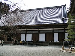 【瑞巌寺】 日本三景・松島に有る瑞巌寺。 伊達政宗の創建。単層入母屋造本瓦葺の巨大 な屋根は壮観です。 造営には熊野の木材が使われ、京都から名工 130人が集められたとの事。 青葉城に万一の事が有った場合の「城」も意識 して造営された。 ↓左が本堂、右が庫裏 |