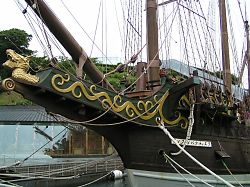 ←【サン・ファン・バウテスタ号】:石巻市 慶長遣欧使節団に使用された復元船。 仙台藩主伊達政宗により建造され、慶長18年(西暦1613年)藩士・支倉常長ら一行180名 を乗せ月の浦(現石巻市)から出帆した黒船です。イタリア・バチカン王国のローマ法王に会うた め太平洋を往復しました。 謎めいた「遣欧使節団」であり、キリスト教迫害の時期に奥州王として、スペイン領メキシコと の通商のとりなしを請願しますが目的は果たせませんでした。 歴史からは抹消され、一般には「何それ?」と、余り知られていないようですね。 |
