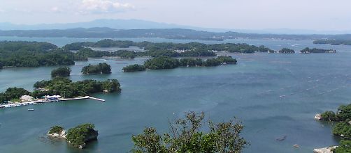 | 【日本三景・松島】→ 松島湾に浮かぶ島々の景観が美しい。 観光コースとしては、塩竃市から湾内を縦断 する、松島から湾内を一回りする等幾つかが 有りますが、東松島市・宮戸島の「嵯峨渓」は 男性的な景観を見せてくれます。 宮戸島の高台、大高森からの松島の景観→ |