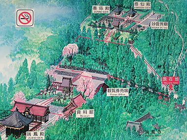 | うっそうと茂る杉木立を登っていくと、政宗の瑞鳳殿と二代目・三代目の廟が現れてきます。写真右は、各廟の配置図です。 |