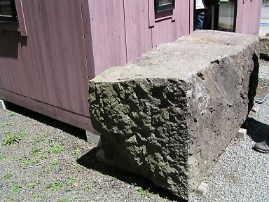 | 本丸跡に到着です。上から見た石垣。石垣に使われている石の見本(破損品の見本展示) | |