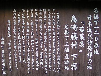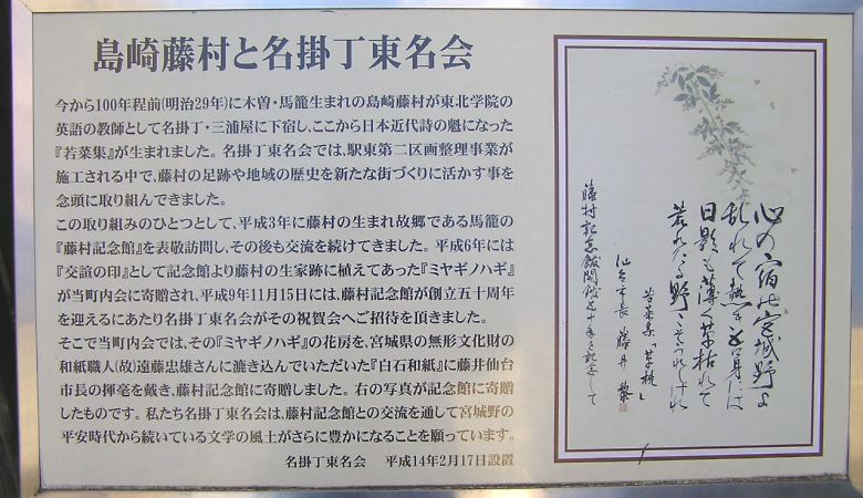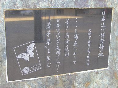 | JR仙台駅東口広場・交番の脇の通りは、『初恋通り』と名付けられその先に藤村広場が有ります。 島崎藤村は、教え子への”初恋”に破れ親友の自殺と言う東京の悩み多い生活から逃げるように東北学院の教師と して仙台にやって来ました。 東北学院の教師として在任中に下宿した3ヶ所のうちその一つが三浦屋でした。 |