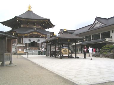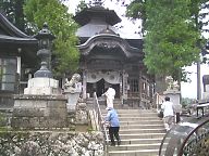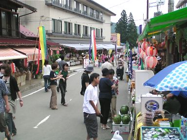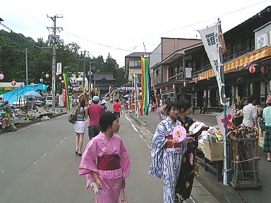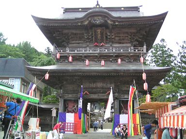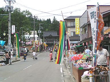 | 山門の前にはお土産屋・旅館などが立ち並び門前町を形成しています。この日は丁度、夏のお祭りの日。大勢の観光客が訪れていました。 |