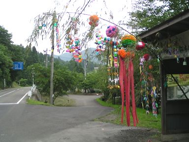 | 仙台の七夕は8月。バス停に七夕飾りが有りました。 |