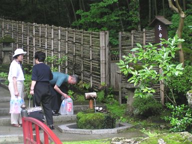 | 貞能堂の裏手側には「長命の水」があり、お持ち帰りの方もいます。 |