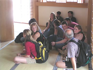 | 本堂の内部。 ロータリークラブがアメリカから招待した学生達も、興味津々で祈祷の様子を見学していました。 |