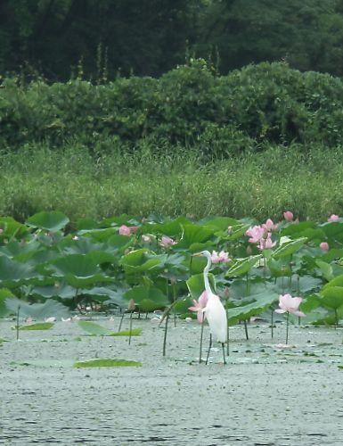 | ダイサギも蓮の葉に乗って、ハスの花観賞でしょうか。 |