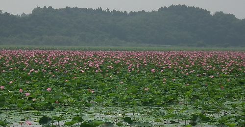 | ◆伊豆沼の蓮 下記の若柳会場近く伊豆沼・内沼サンクチュアリーセンターと、 2段下の迫会場北部からの景観 |