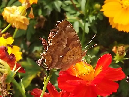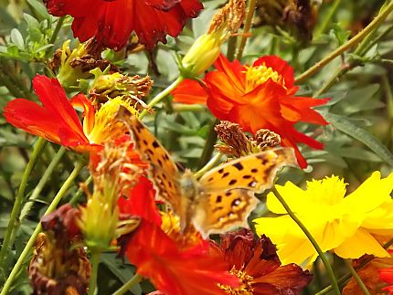 花に蝶が舞っています。 キタテハ。