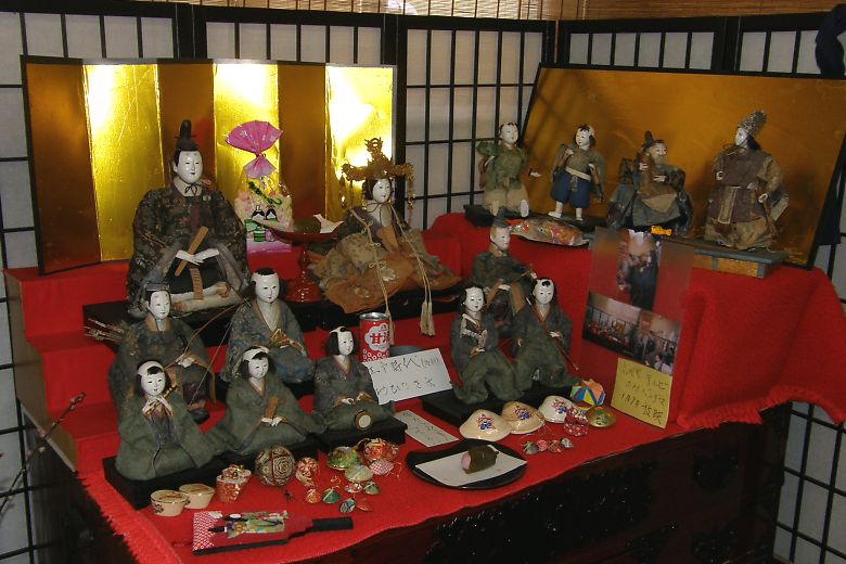 散歩中の増森ストアー(右上の↑二番目のお店)のご主人に、江戸時代のお雛様が店の奥に飾ってあるので見て