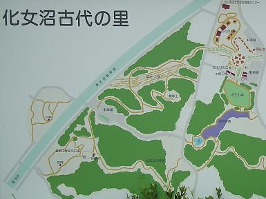 | 大崎市の東北自動車道・長者が原SA(ETC出入り口)の近くに化女沼古代の里があります。 MAP マップコード: 141 460 240*44 右上の案内図の右上部分が「公園施設」で、下の写真の「古代の村」もあります。 宮沢遺跡(後述)は南西部一帯になるようです。 |