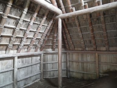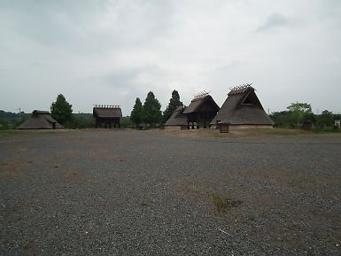 | 大きな看板塔の北側には「古代の村」と言う、九州佐賀県の吉野ヶ里遺跡の竪穴住居・高床倉庫などが再現され ています。 |