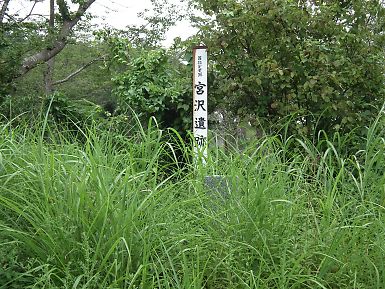 | 訪問したのは夏(2010.8.1)でしたので花は終わっていましたがシーズンは綺麗でしょうね。 散歩道には木製の動物彫刻が設置されていて楽しいです。 ここから、東側一帯が下記で紹介する「宮沢遺跡」です。 目印は、赤白の高圧線鉄塔です。 |