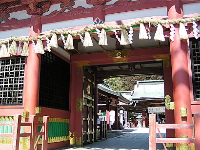| 長い階段の有る表参道の山門。 | 進んでいくと、本殿前に唐門があります。 |