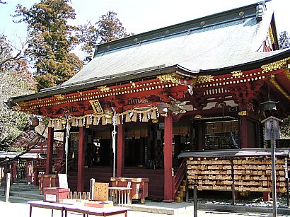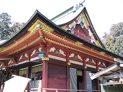 | 左の写真は拝殿を左手から見たところ。和泉三郎寄進の鉄宝燈がある。彼は、平泉の藤原秀衡の3男で藤原忠衡が本名。義経を最後まで守り23歳の若さで兄泰衡に滅ぼされた。 右の写真は「別宮」。 | |