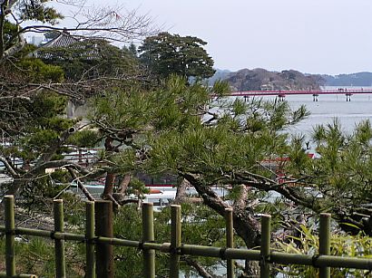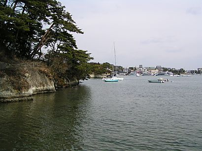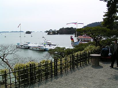 | ここからは、落ち着いて湾内が眺望できる。左の写真の左手が五大堂。 特に芭蕉も感動したと言う松島の「月見」は 最高と言うことである。一休み後、また、観光の中心地に向かうこととする。 |