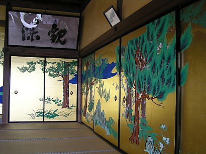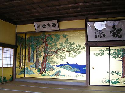 | 内部の茶室は、キンキラの当時の代表的画家、狩野法眼山楽の室内装飾がされています。 秀吉が京都伏見の桃山城内に建てた36畳の大茶室。日本随一の純桃山建築といわれています。 |
