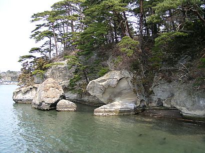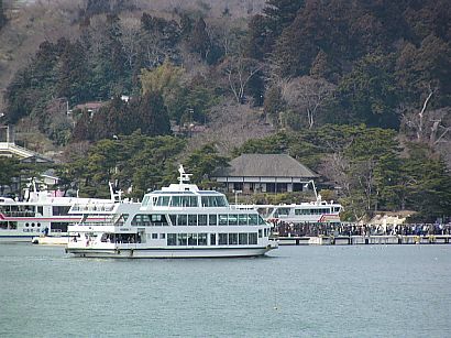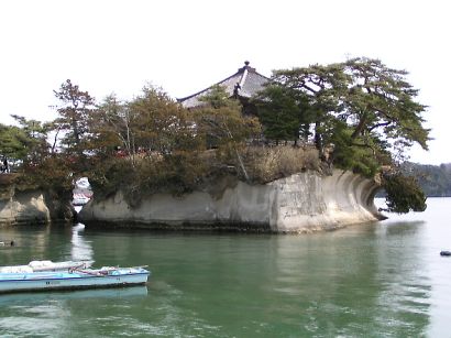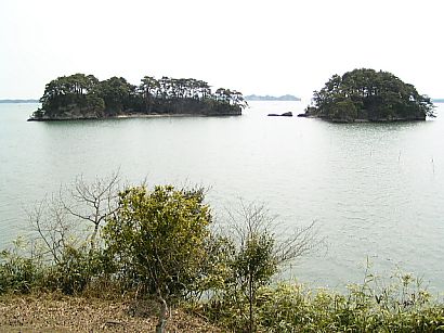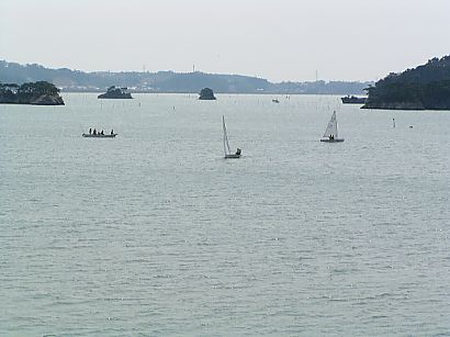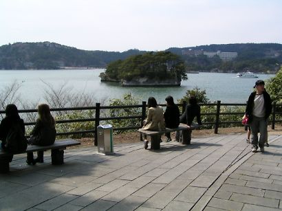 | 観光桟橋と、観瀾亭の遠景。 島内を散策すると、1〜2時間は過ぎてしまうので、所謂ツアーには絶対組み込まれない 観光スポットです。空気が澄んでいると宮城県の最東端、牡鹿半島まで見ることが出来ます。 |