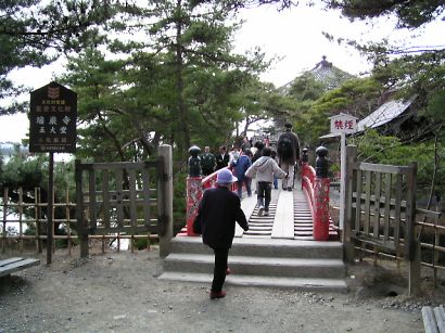 | 松島の象徴、五大堂。 瑞巖寺の海岸出張所ともいえるお堂。海岸から、すかし橋と言う線路の枕木のような横木に、 細い巾木が掛けられている橋を渡って行きます。足元を良く見て、雑念を捨てて橋を渡れ!と言う意味があります。 |