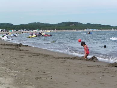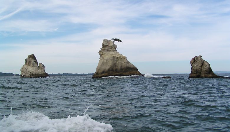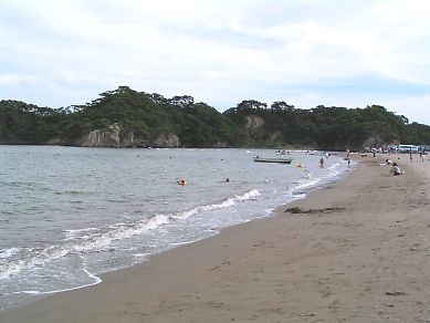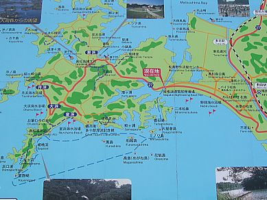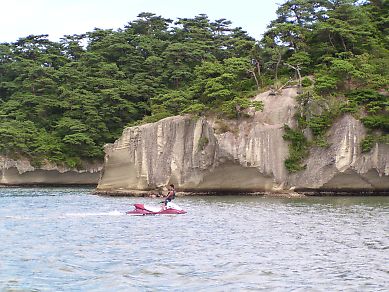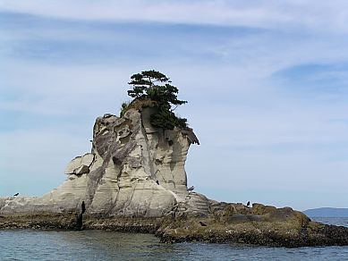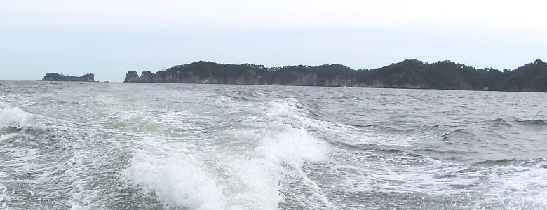 | 嵯峨渓は、松島(松島海岸)から大きめの観光船も出ていますが、より身近に楽しむ為にはモーターボート型の観光船 がお勧めです。野蒜海水浴場の室戸島の入り口から出ています。(上の案内図、赤い四角の現在地表示のところ。中央から左下 にかけて破線が見えますが、これが観光コースになります。 ちなみに、前頁の大高森は"現在地表記"の左手、道路が半円状になっている所。) それでは、出かけましょうか。この頁では点在する小さな島の景観をご紹介します。 なお、水平線が傾いていますので船に乗っているつもりでご覧下さい(~~; |