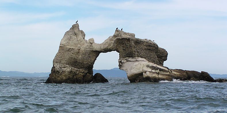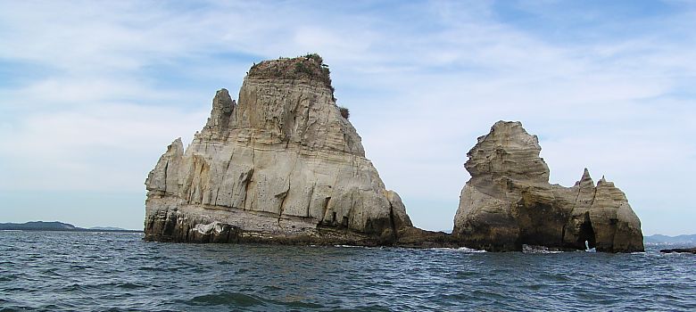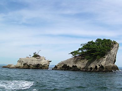 | 島の名前はいろいろ聞きましたが、メモする暇がありませんので…。 上の写真は奥松島でナンバーワンの知名度 を誇るめがね島。白黒の横じま地層の対比と、真ん中の侵食洞窟が綺麗です。 |