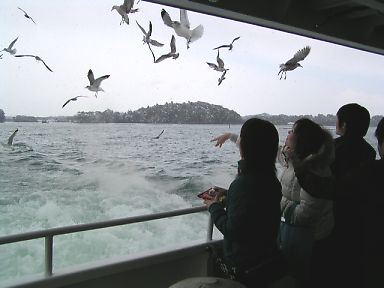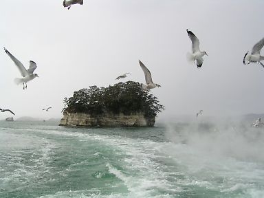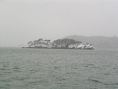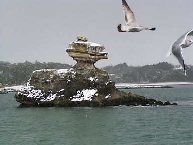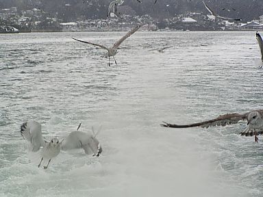 | 小雪舞い散る湾内に、観光船に乗って出てみます。船の後を餌を求めてカモメが着いて来ます。 | |