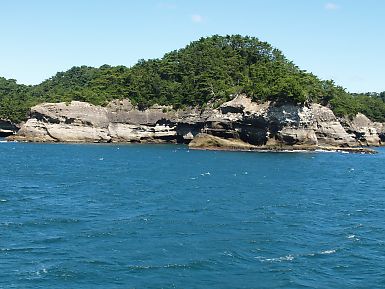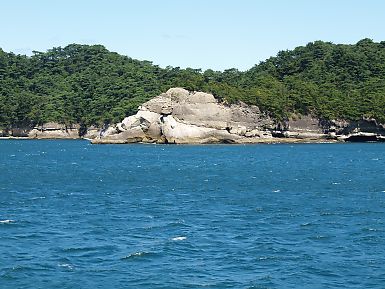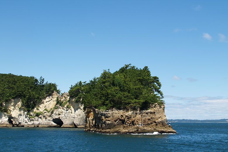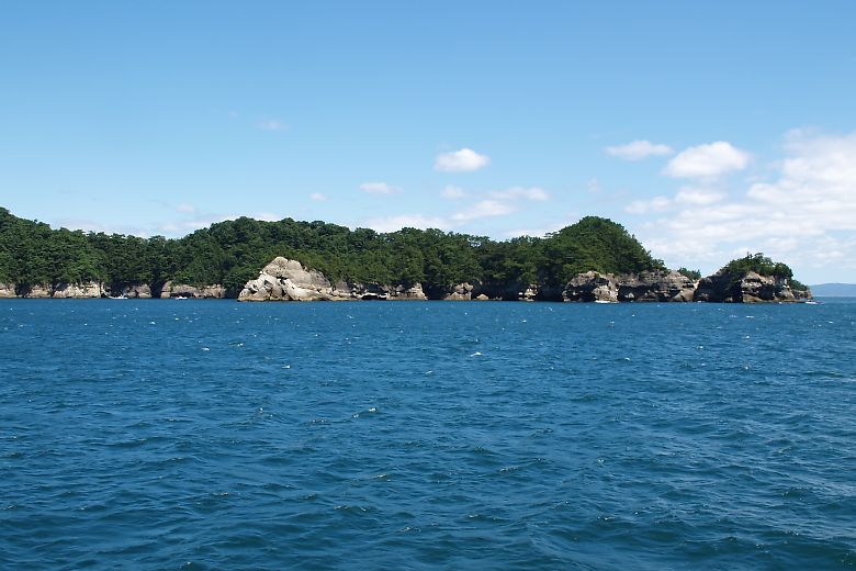 奥に、石巻市や牡鹿半島の陰が見えます。いよいよこの裏側が嵯峨渓です。