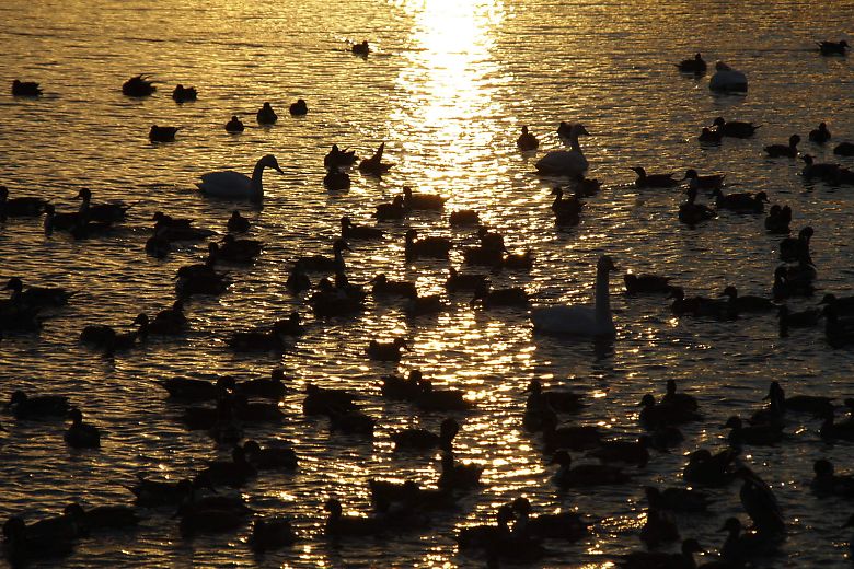 雲の間から太陽が顔を見せ始めました。 朝日に輝る水面の鳥たちのシルエットをご覧頂きます
