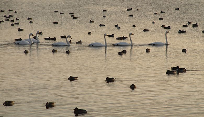 | 完全に日が昇っていました。朝焼け気味の大沼ではもうかなりの数の白鳥が飛び立ったようです。 | |