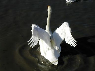 ハスの茎をついばむ白鳥。 美しい羽を披露する白鳥。