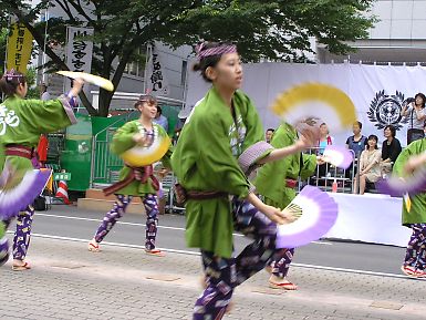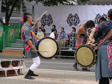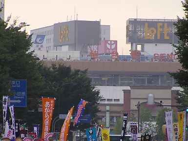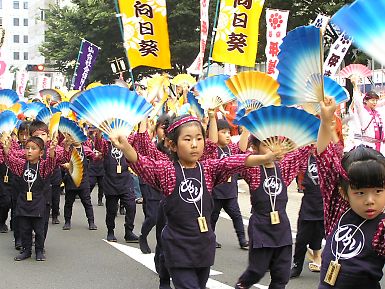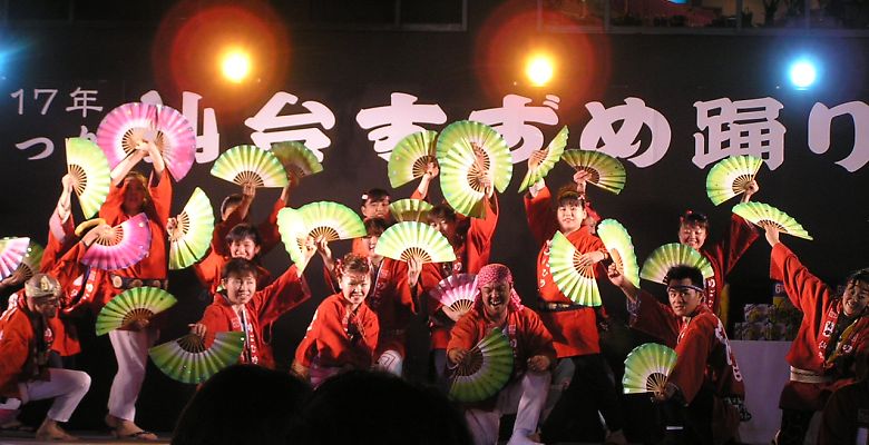 | すずめ踊りは、長年5月開催の青葉祭りで踊られてきましたが、それとは別に、夏のお祭としても定着させようと 2003年から7月末に催行されるようになりました。例年8月6・7・8日開催の仙台七夕まつりとともにみちのく仙台の 夏の風物詩です。会場は仙台駅東口です。 |