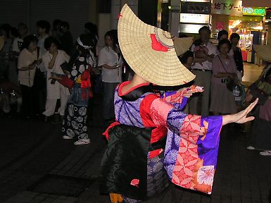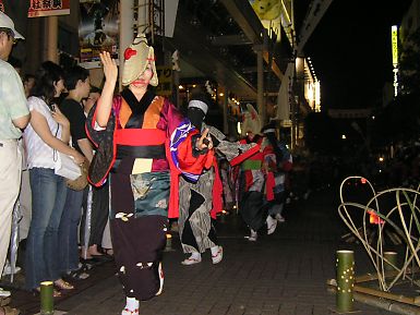端布を縫い合わせた独特の衣装が、ストリートに並びました。 そうです、国指定重要無形民族文化財・秋田県羽後町の 『西馬音内盆踊り(にしもないぼんおどり)』です。 仙台にも愛好家が多く、本来であれば2006年8月12日13日に仙台市 勾当台公園市民広場でカルチャー教室の受講生など100名+一般参 加で披露されるはずでしたが、本家から『商標登録済み』だとクレーム がつき中止の憂き目に遭ってしまいました。 代替案として、この一番町四丁目商店街開催の『仙台竹灯り』の イベントの一つとして披露されるようになったようです。 地域文化を守る事も当然必要かと思いますが、そんな杓子定規に事 を運ばすに、むしろオープンにしてファンを広げ『本場』に観光客を誘導 した方が良いように私などは思うのですがねぇ(爺ぃのつぶやき) 尚、本場の踊りを見てきましたので こちら も参照下さい |