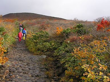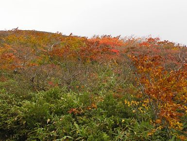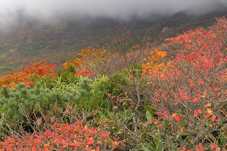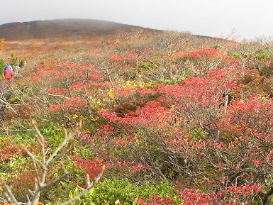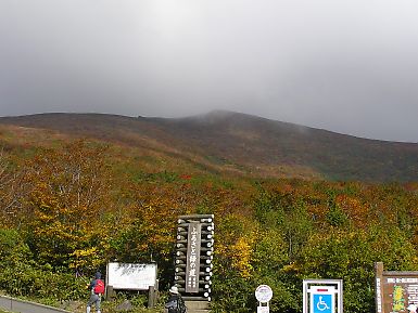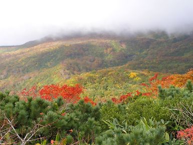| 2006.10.9 見頃との情報に宮城県北部・栗駒山へ紅葉狩りに行ってみました。 ガスがかかっていますが物凄い風が吹き、時々そのガスが薄くなり日が差したりしてます。山頂付近から中腹辺り までは既に終わっていますが、写真を撮りながら小一時間ほど、いわかがみ平から登ってみます。 |