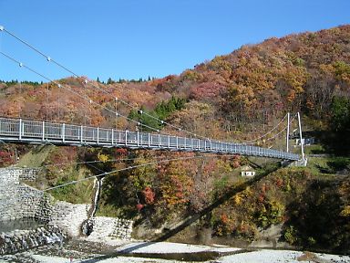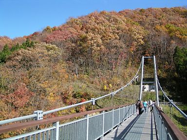 横川渓谷:長老湖の一つ峰を越したところにつり橋が有り、ここからの不忘山と紅葉が美しい。