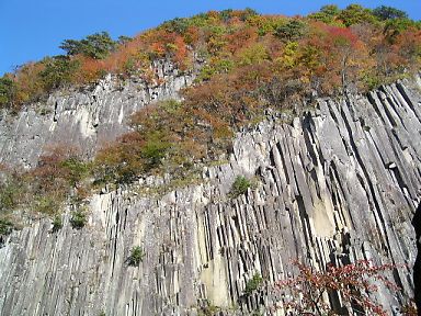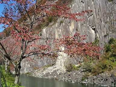 | 七ヶ宿ダムの直下の位置に名勝「材木岩」が有ります。岩が「条理」で材木を立てかけたような岩肌に、紅葉が 彩りを添えます。 公園入り口には、検断屋敷(国境警備官)・旧木村家の復元屋敷が有ります。右手が材木岩全景。 |