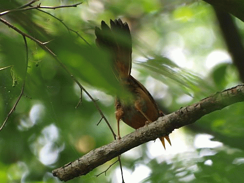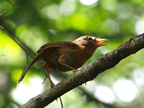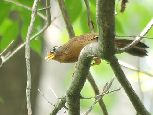 | スズメ目 チメドリ科 ガビチョウ(画眉鳥、学名 Garrulax canorus) 大きさ: 22-25cmcm。 鳴声: かなり大きな音色で美しく囀る。ウグイスやキビタキ、オオルリ、 サンコウチョウといった他種の囀りをまねることがある。 特徴 :嘴と尾が長い。体色は全体的に茶褐色でかなり地味であるが、 眼の周り及びその後方に眉状に伸びた特徴的な白い紋様を持つ。 嘴の色は黄色。 生態: 留鳥。 南東北、関東、中部、九州北部で見られる。 中国南部から東南アジア北部にかけて広く生息する。 日本では、ペットとして輸入された個体がかご脱けにより定着した。 同属のカオグロガビチョウ、カオジロガビチョウと共に外来生物法で 特定外来生物に指定されており、日本の侵略的外来種ワースト100 選定種にもなっている。 撮影: 2011.8.15 宮城県仙台市宮城野区鶴ヶ谷中央公園内 |
