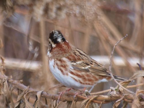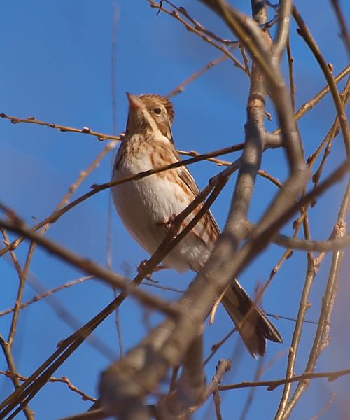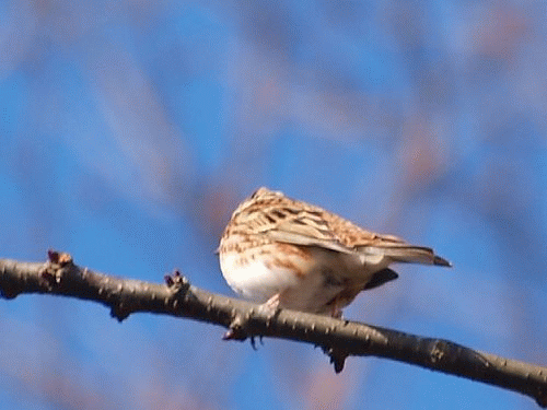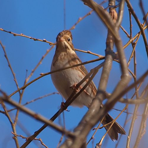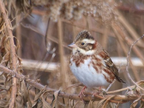 | スズメ目 ホオジロ科 大きさ:15cm。 鳴声:地鳴き チッと一鳴き。 特徴: 短い冠羽がある。 上面は茶褐色で、背に黒い縦班があり、腰は赤褐色。 生態: 冬鳥として全国に飛来し、群れで行動。。 撮影: 2011.01.16 宮城県仙台市宮城野区鶴ヶ谷中央公園内 |