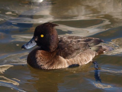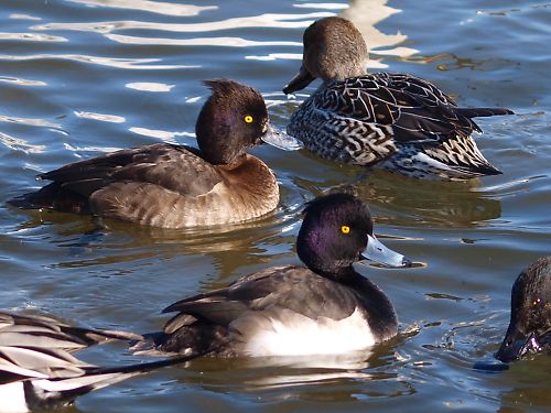 | ガンカモ目 ガンカモ科 大きさ:40cm。潜水採餌(せんすいさいじ)の代表格。 特徴: オスは、頭部が紫色光沢の有る黒色で頭の後ろに冠羽を持ち 愛嬌が有る。 脇と腹は白い。クチバシは青灰色で先端に黒い 横班がある。虹彩は黄色。 メスは、黒褐色で腹は白い。冠羽は短い。 翼と尾は黒い、外側尾羽は白い。腰と体の下面は黄色い。 生態: 主に冬鳥として飛来する。 撮影: 2011.01.16 宮城県利府町 加瀬沼公園内 |
